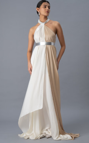 Step into contemporary elegance with the Amit Aggarwal Soft Ivory Crepe Chiffon & Metallic Polymer Dress. Crafted from luxurious crepe chiffon and accented with metallic polymer detailing, this dress combines fluid movement with modern, architectural style. The soft ivory tone offers a sophisticated, versatile look, while the unique metallic accents add a striking, avant-garde touch. Perfect for evening events, fashion-forward parties, or special occasions, this dress ensures you stand out with effortless grace. Pair with minimalist heels and subtle accessories to complete the high-fashion ensemble.